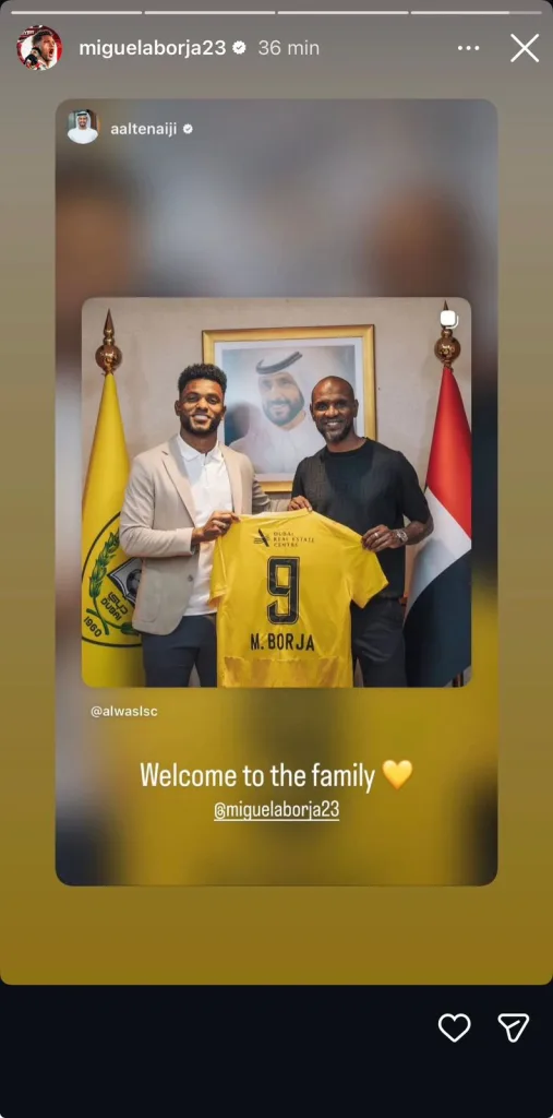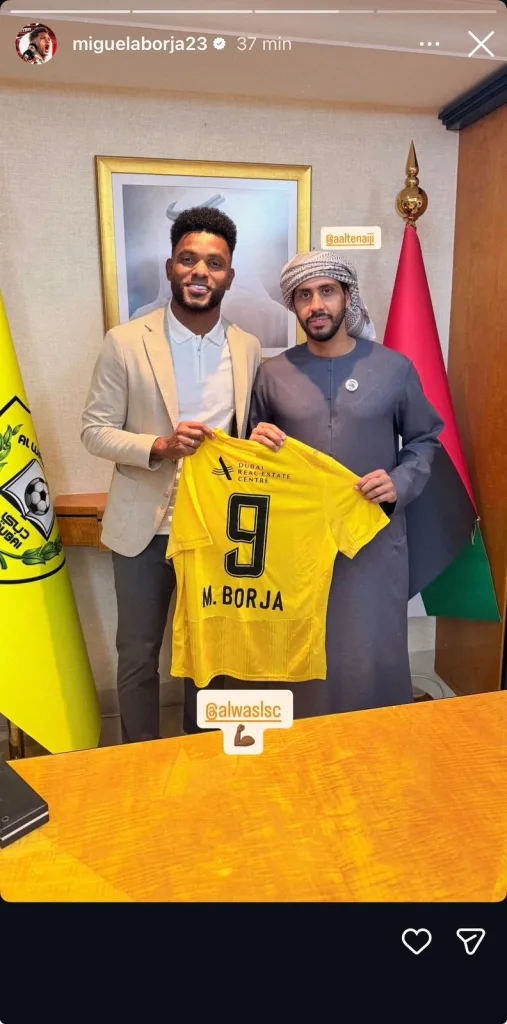 En sus historias de Instagram, Miguel Borja compartió varias imágenes de su presentación con el Al Wasl de los Emiratos Árabes Unidos, lo que ocurrió poco más de 24 horas después de dar por terminadas las negociaciones con Cruz Azul.