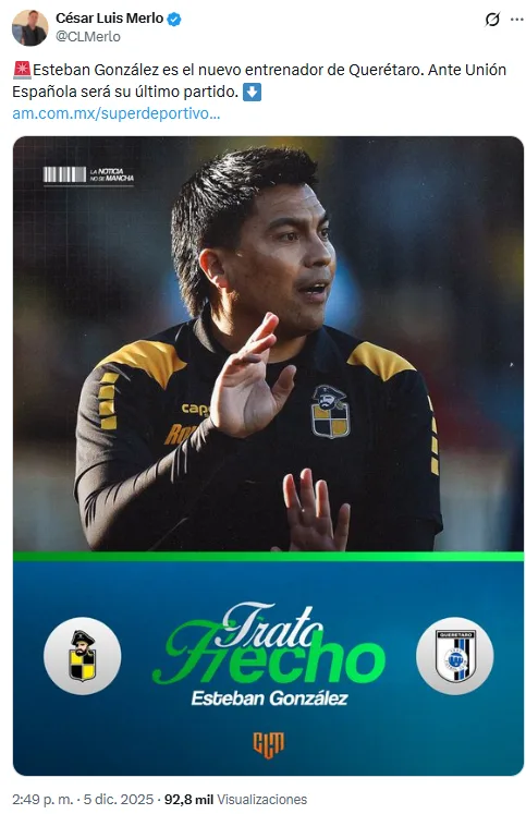 Según informa César Luis Merlo, el nuevo entrenador de los Gallos Blancos de Querétaro será el chileno Esteban González. El estratega hizo la mayor parte de su proceso formativo como entrenador en Coquimbo Unido, pasando de ser entrenador asistente, a entrenador interino y ser confirmado como DT del primer equipo.