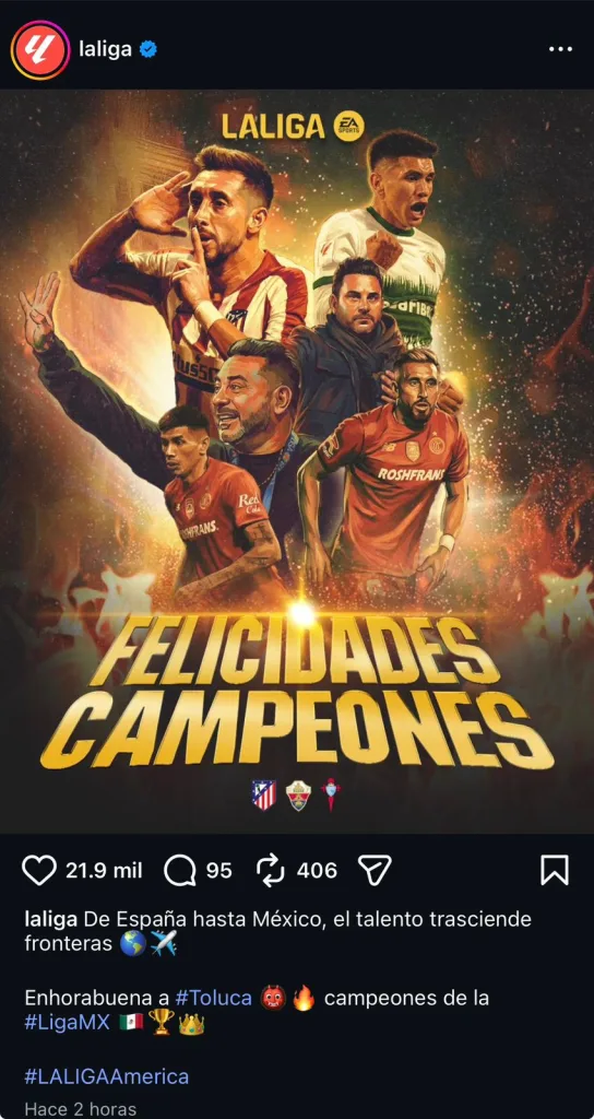 Apenas había terminado la larguísima tanda de penales entre Toluca y Tigres cuando la cuenta oficial de LaLiga de España mandó una felicitación a los Diablos. Desde su perfil de Instagram, donde cuenta con más de 54 millones de seguidores, compartió un par de publicaciones.