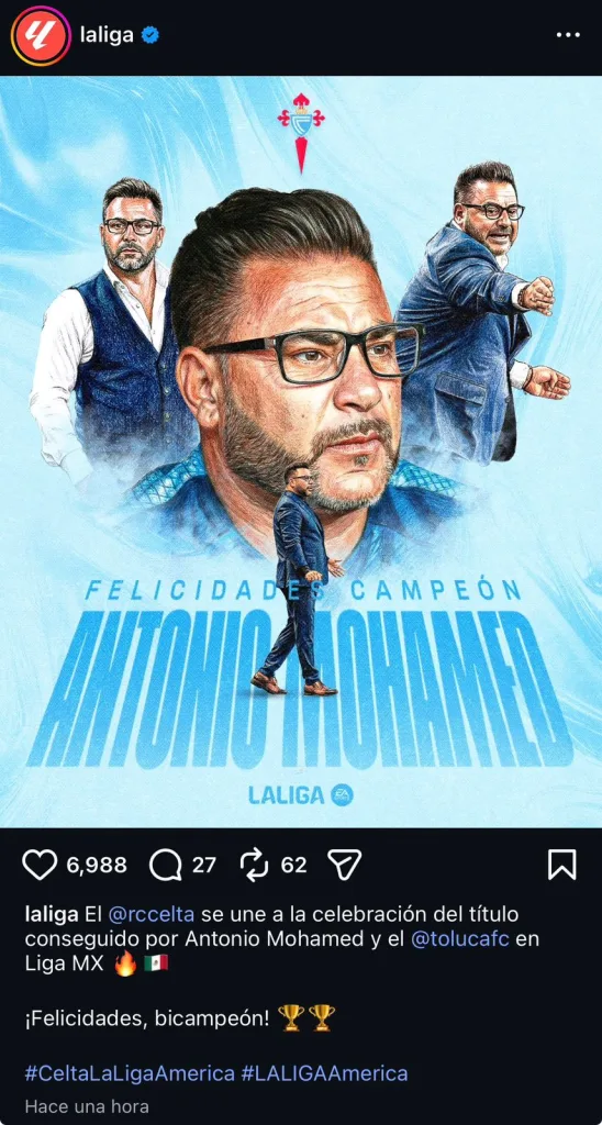 “El Celta de Vigo se une a la celebración del título conseguido por Antonio Mohamed y el Toluca en Liga MX. ¡Felicidades, bicampeón!”