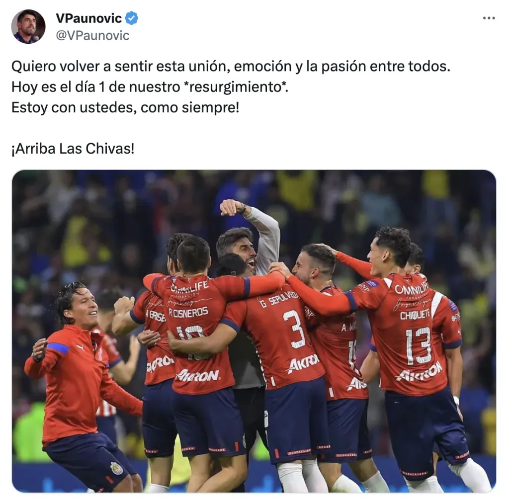 “Quiero volver a sentir esa unión, emoción y la pasión entre todos. Hoy es el día 1 de nuestro resurgimiento. Estoy con ustedes, como siempre. ¡Arriba las Chivas!