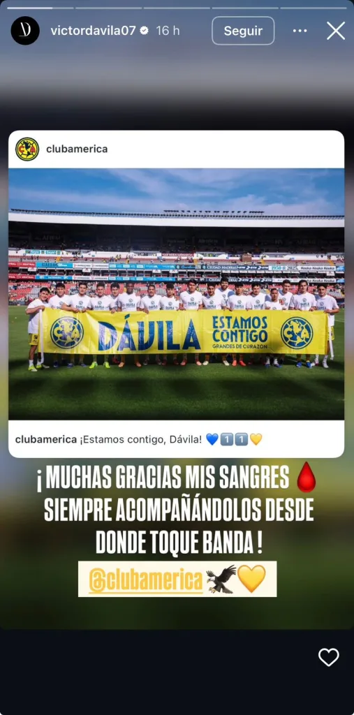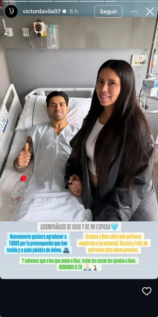 En sus historias de Instagram, Víctor Dávila compartió una imagen desde el hospital tras salir de cirugía. El futbolista del América aparece acompañado por su esposa mientras está acostado en una cama y con una bata de paciente.