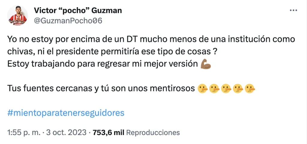 “Yo no estoy por encima de un DT, mucho menos de una institución como Chivas, ni el presidente permitiría ese tipo de cosas. Estoy trabajando para regresar mi mejor versión. Tus fuentes cercanas y tú son unos mentirosos”
