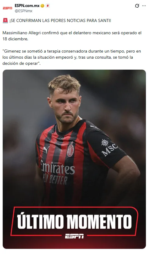 - AC Milan informó que Santiago Giménez fue operado del tobillo derecho.