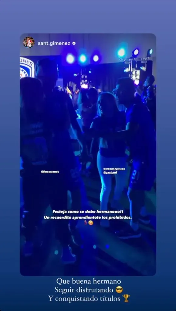 Hace algunos minutos, Santi Giménez publicó un video de ellos dos bailando con sus respectivas parejas en el festejo del Cruz Azul campeón.