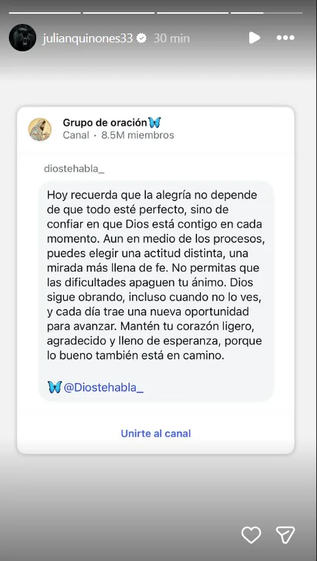 “Hoy recuerda que la alegría no depende de que todo esté perfecto, sino de confiar en que Dios está contigo en cada momento. Aun en medio de los procesos, puedes elegir una actitud distinta, una mirada más llena de fe. No permitas que las dificultades apaguen tu ánimo. Dios sigue obrando, incluso cuando no lo ves, y cada día trae una nueva oportunidad para avanzar. Mantén tu corazón ligero, agradecido y lleno de esperanza, porque lo bueno también está en camino”.