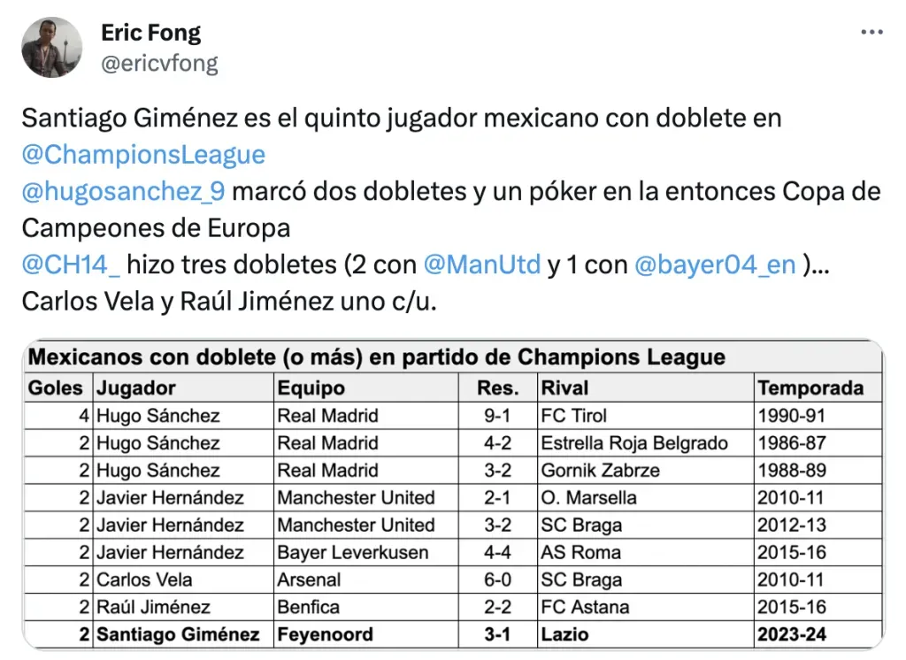 Ahora, Santiago Giménez ya ingresó a esa selecta lista y es muuuy probable que sigamos viéndolo con actuaciones de este tipo, y qué mejor que en la competencia más importante a nivel de clubes, como lo es la gloriosa Champions League.
