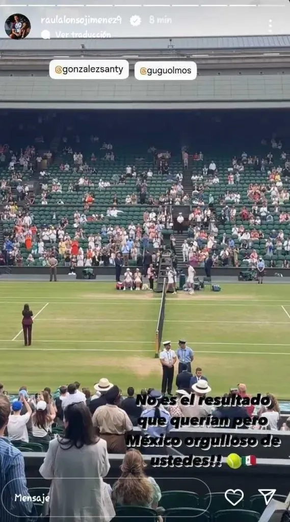 “Tiempo de apoyar a México”, escribió en una foto en la que se podía ver la cancha central de Wimbledon durante el partido de dobles mixtos. Luego del encuentro, el exWolverhampton compartió fotos a través de sus redes una foto con un mensaje de apoyo para los tenistas mexicanos.