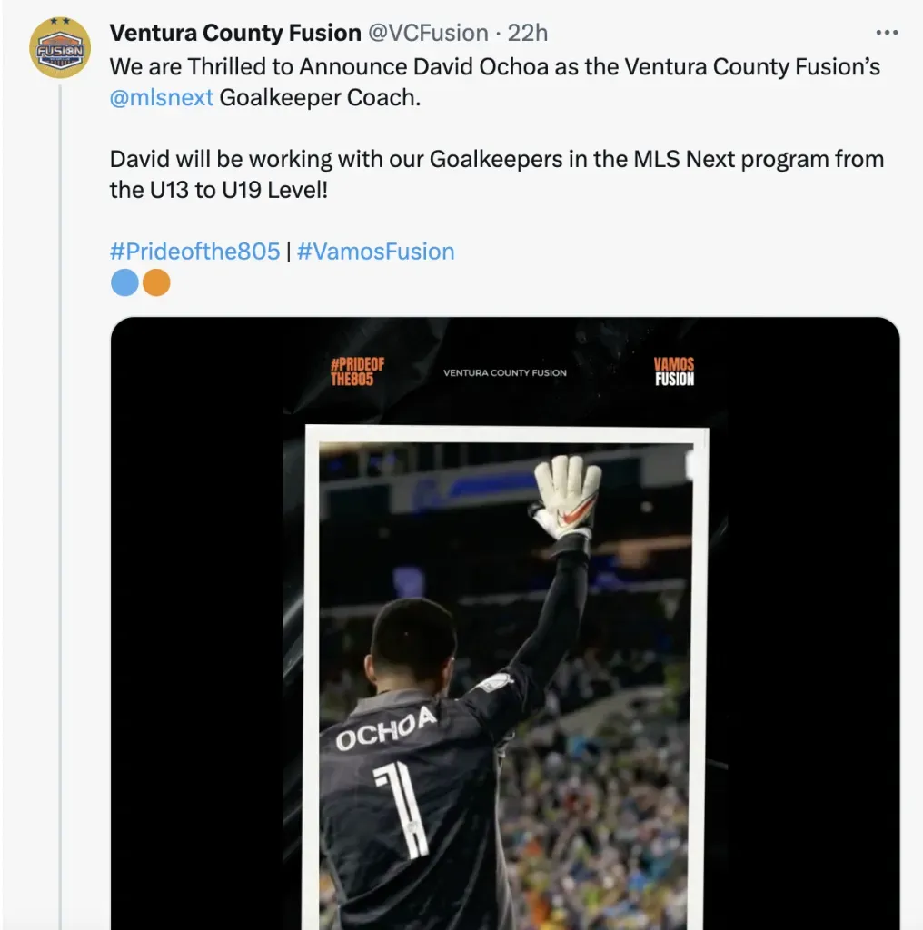 Y fue así como David Ochoa estará a cargo de los guardametas del Ventura County Fusion de California, club que milita en la United Soccer League 2, que es la Tercera División de Estados Unidos.