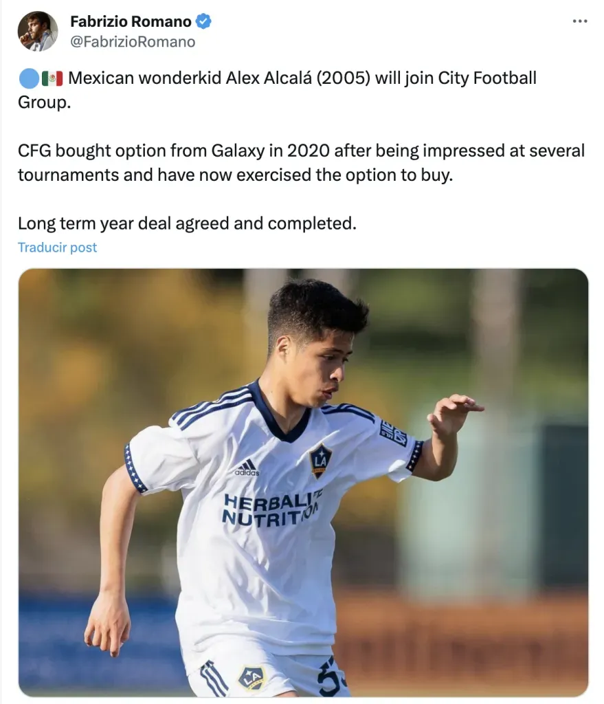 “El prodigio mexicano Alex Alcalá (2005) se incorporará al City Football Group, que compró la opción de Galaxy en 2020 después de quedar impresionado en varios torneos y ahora ejerció la opción de compra. Acuerdo anual a largo plazo acordado y completado”