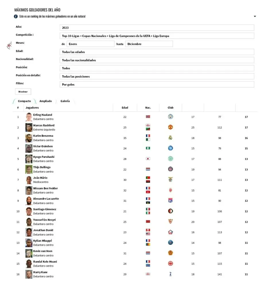 Como es el caso de Kylian Mbappé, quien en este listado está en el puesto 13 con 11 anotaciones, lo que dejó al meza en el sitio 10 al sumar en estas competiciones un total de 12 goles en lo que va del año.