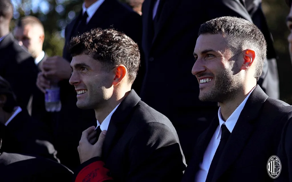 Santi Giménez junto a Christian Pulisic, luciendo los elegantes trajes. (@acmilan)