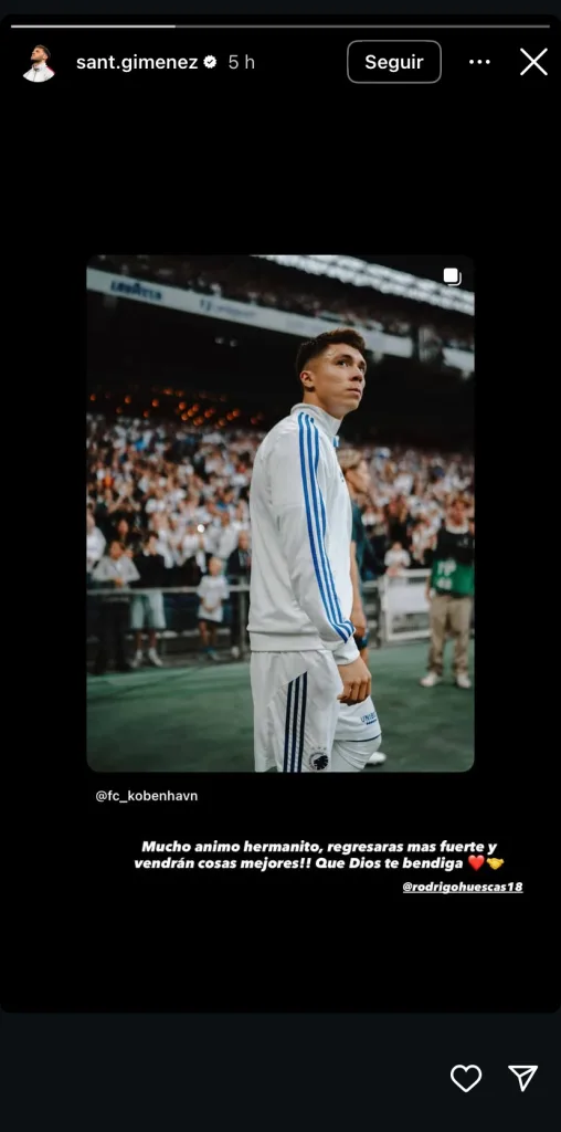 Santiago Giménez ha publicado una Historia en su cuenta oficial de Instagram, en la cual ha escrito, ”Mucho ánimo hermanito, regresarás más fuerte y vendrán cosas mejores!! Que Dios te bendiga”.