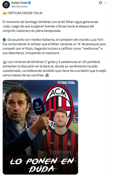 Medios italianos reportaron que Luca Toni cuestionó el rendimiento ofensivo del AC Milan, al señalar que el equipo carece de un delantero centro de jerarquía. Sus comentarios incluyeron a todos los atacantes del plantel.