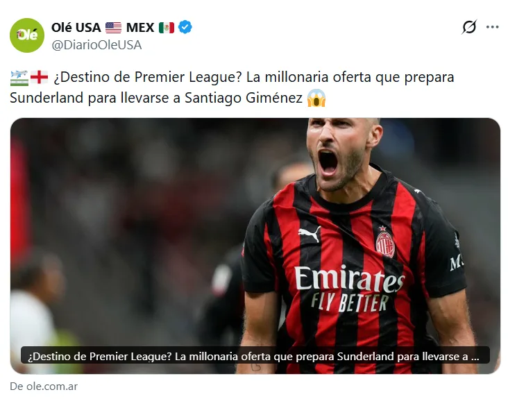 Santiago Gimenez estaría muy, pero muy cerca de un equipo de la Premier League y lo más impactante, son los millones que un club de esta liga pagaría por el mexicano que ahora está en el AC Milan.