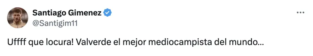 Uf, qué locura. Valverde es el mejor mediocampista del mundo“, fue el comentario que el Bebote Giménez realizó en redes sociales, en donde inmediatamente surgieron reacciones, señalando muchos de los usuarios que sería un guiño para el cuadro merengue.