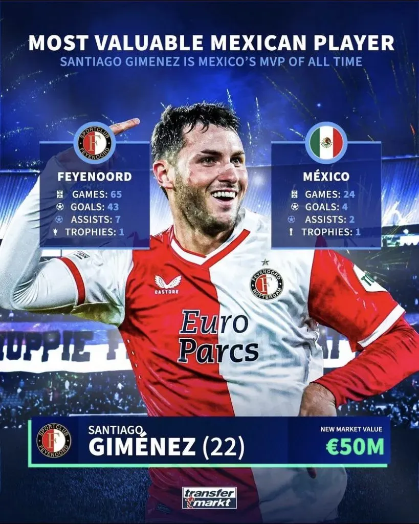 El 2023 está a días de llegar a su fin y se ha convertido en uno de los años de ensueño para el naturalizado mexicano Santiago Giménez. Quien estará cerrando el año a lo GRANDE, pues se ha convertido en el mexicano MÁS VALIOSO DE LA HISTORIA.