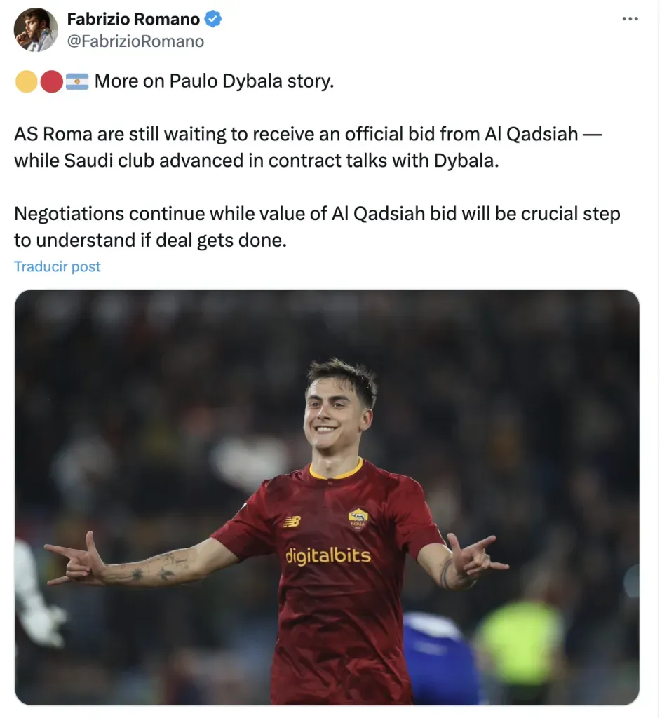 La fuente señala que el equipo árabe ya tendría apalabrado su fichaje con Paulo Dybala, mientras que la Roma aún se mantiene en espera de una oferta formal, para poder avanzar en las negociaciones.