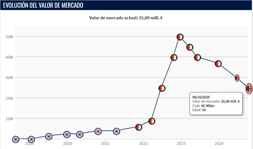 De acuerdo con lo reportado por el medio Transfermarkt, Santiago Gimenez pasó de costar 50 millones de euros estando en el Feyenoord, a valer 25 millones en el AC Milan.