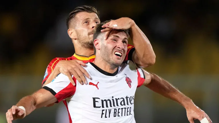 © Getty Images. Santiago Gimenez disputa un balón a Ylber Ramadani del Lecce, en un duelo ante el AC Milan.