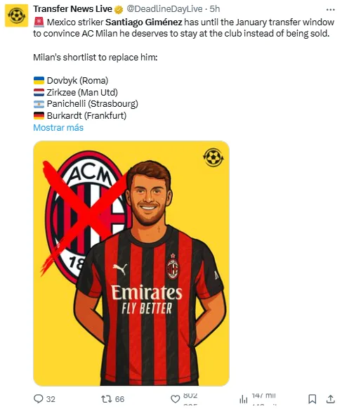 La fuente sacó a relucir algunos nombres que suenan en las oficinas de AC Milan de cara al próximo mercado de pases ante el mal momento de Santiago Giménez. Entre los posibles sustitutos se encuentran Artem Dovbyk (AS Roma), Joshua Zirkzee (Manchester United), Joaquín Panichelli (Estrasburgo) y Jonathan Burkardt (Eintracht Frankfurt).