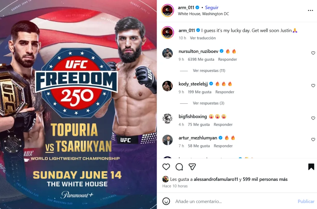 Mientras tanto, Tsarukyan sigue calentando un posible combate con Topuria por medio de redes sociales o entrevistas, resaltando que cumple con los méritos deportivos para ir por el cinturón.