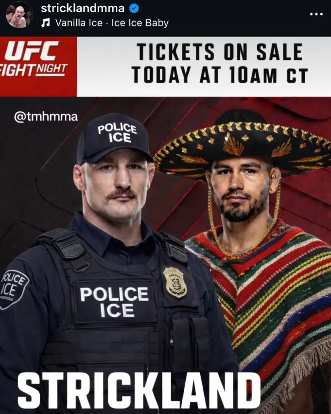 Es semana de pelea y la UFC se prepara para el Fight Night: Strickland vs Hernandez. El peleador estadounidense, reconocido por sus opiniones racistas, ha calentado la pelea con una imagen suya disfrazado como un agente del ICE (Servicio de Control de Inmigración y Aduanas), sabiendo de las raíces mexicanas de su adversario.