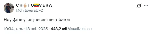 Con un corto y contundente mensaje, el Chito Vera acusó a los jueces de robo en este UFC Fight Night. “Hoy gané y los jueces me robaron” dice el mensaje del peleador por medio de sus redes sociales.