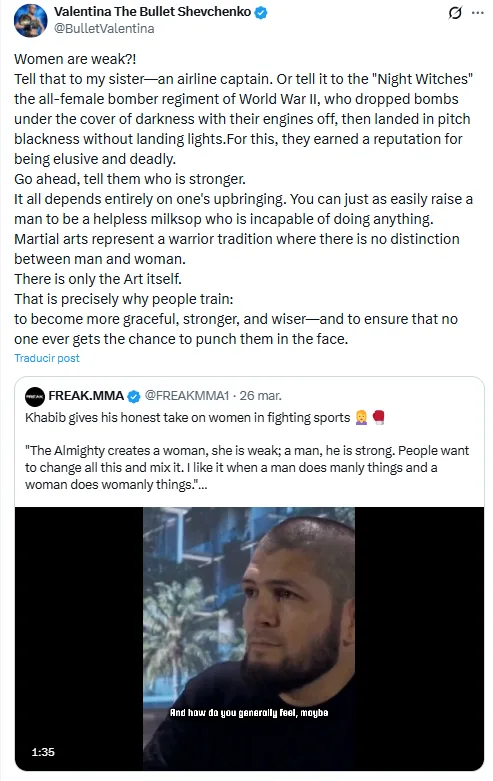 Los dichos de Khabib se hicieron rápidamente virales y llegaron a la actual campeona del peso mosca de la UFC y líder del ranking libra por libra femenino, Valentina Shevchenko. La peleadora kirguisa emitió un fuerte comunicado en redes sociales.