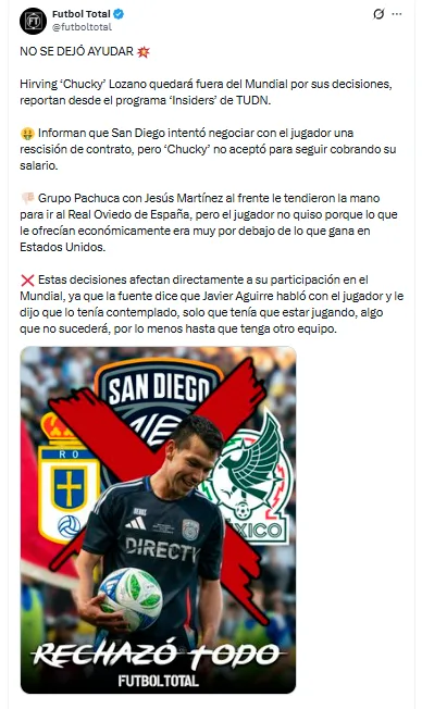 La misma fuente asegura que, a pesar de que San Diego buscó negociar con Chucky una rescisión de contrato para que pudiera encontrar un equipo que sí lo contemplara para jugar, el futbolista mexicano se negó rotundamente y prefirió seguir cobrando su salario, aun cuando está completamente borrado del equipo.