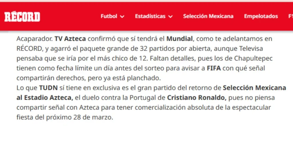 Así lo reveló Carlos Ponce de León en su columna en Récord, quien aseguró que TUDN tendrá en exclusiva el partido de la reinauguración del Estadio Azteca entre México y la Portugal  de Cristiano Ronaldo. Y hay una razón muy específica para esta decisión.
