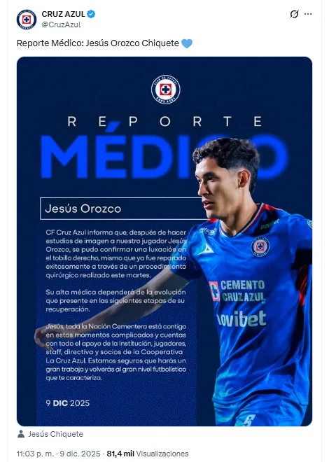 - Cruz Azul confirmó que tuvo una luxación en el tobillo y revelaron que su cirugía fue exitosa.