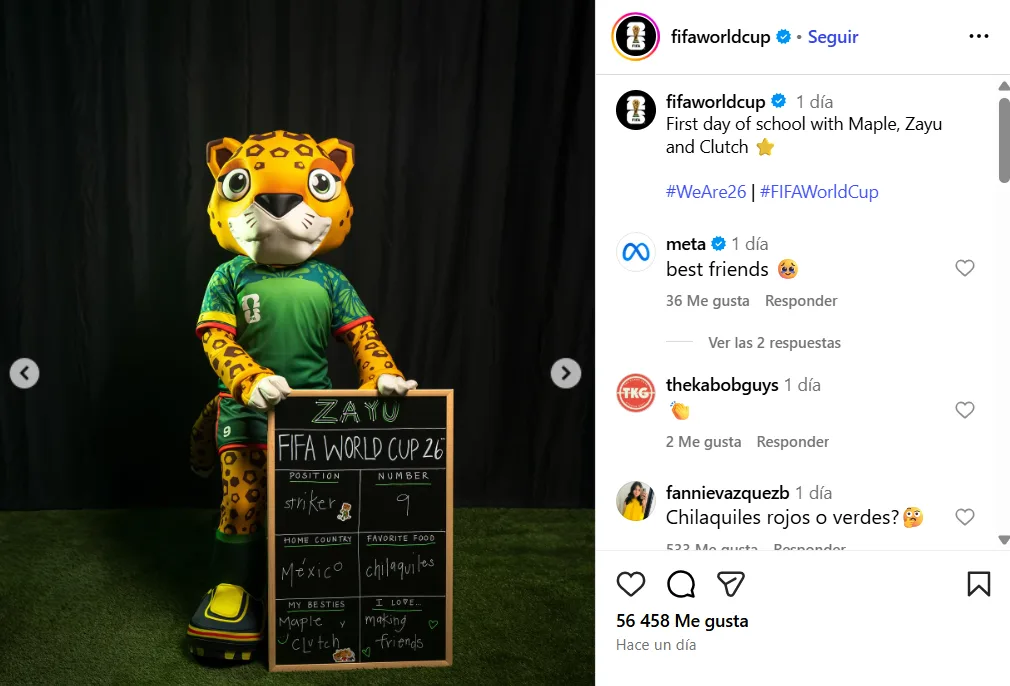 En uno de los últimos posteos de FIFA en sus redes oficiales, aparecen las mascotas emulando una presentación en el primer día de escuela. Cada una de las mascotas sostiene una pizarra, en la que escriben su posición favorita en la cancha, el número de su camiseta, su país de origen, su comida favorita, los nombres de sus mejores amigos y algo que amen hacer.