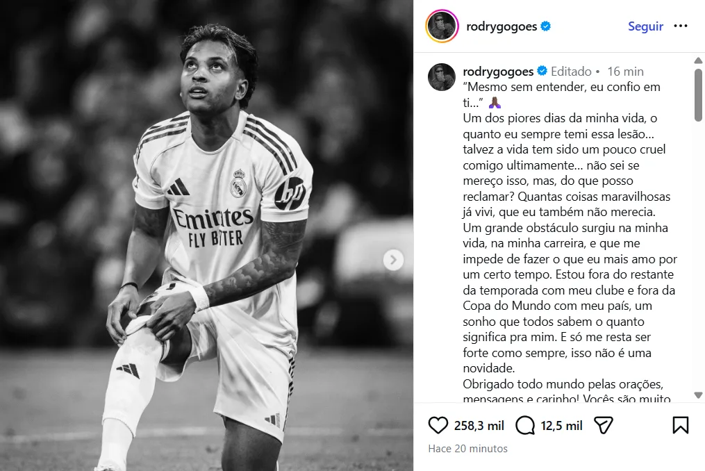 Luego de su lesión en el partido de Real Madrid ante Getafe, Rodrygo recibió la peor noticia de todas. El brasileño se rompió el ligamento cruzado anterior de su rodilla y queda totalmente descartado para el Mundial 2026. El atacante publicó un duro mensaje por medio de sus redes sociales.