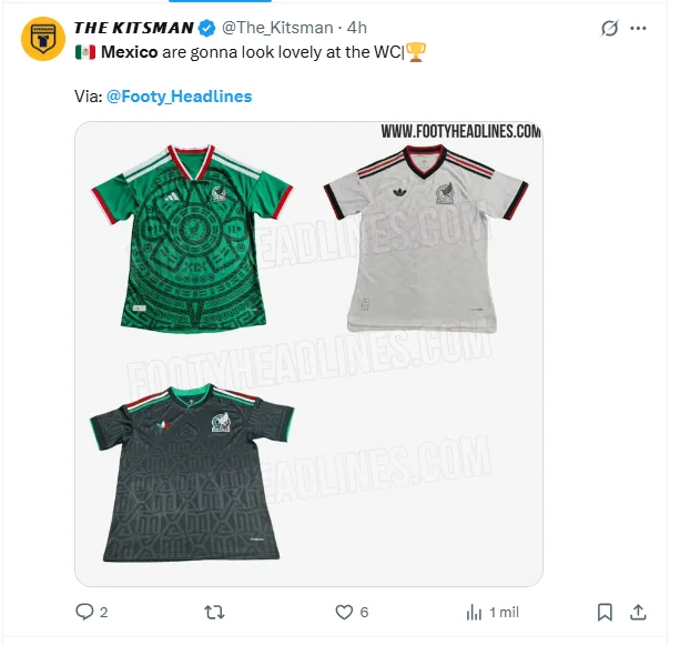 Fue el famoso portal especialista en jerseys, Footy Headlines fue el encargado de filtrar la que sería supuestamente el tercer uniforme que la Selección Mexicana luciría en el próximo Mundial 2026. Por lo que serían tres colores distintos los que utilizarían en la competencia.