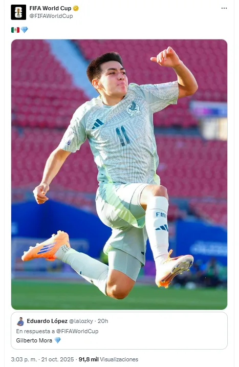El mexicano y juvenil Gilberto Mora no deja de generar expectativa a nivel internacional. Y en esta ocasión fue la FIFA quien sorprendió al presumir al mexicano en las redes sociales que están dedicadas a la próxima Copa del Mundo de 2026.