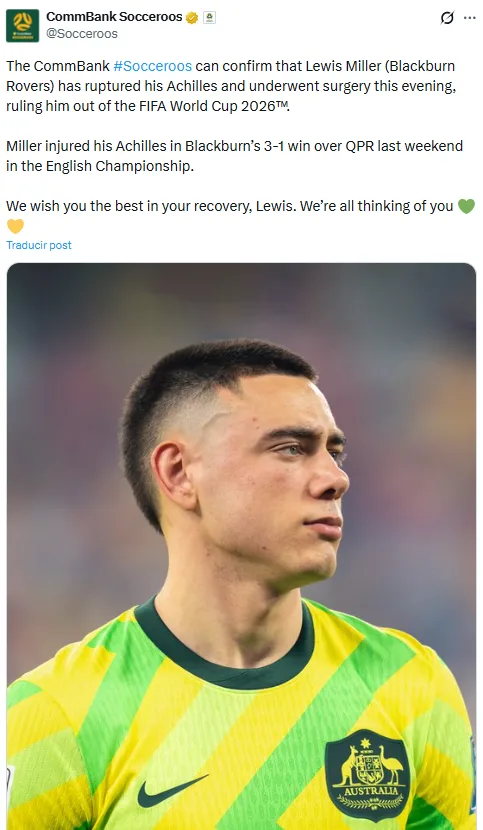Por medio de un comunicado en sus redes oficiales, la Selección de Australia hizo oficial la baja de Miller. “Los Socceroos puede confirmar que Lewis Miller (Blackburn Rovers) se rompió el tendón de Aquiles y fue sometido a una cirugía esta noche, lo que lo descarta para la Copa Mundial de la FIFA 2026. Miller se lesionó el tendón de Aquiles en la victoria del Blackburn por 3-1 sobre el QPR el fin de semana pasado en el Campeonato inglés. Te deseamos lo mejor en tu recuperación, Lewis. Todos estamos pensando en ti“.