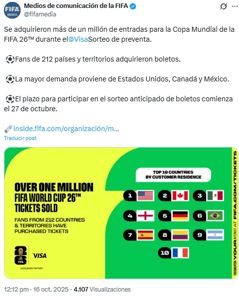 En el comunicado, incluyen el listado de las 10 naciones con más entradas compradas en esta primera etapa. En primer lugar, se encuentra Estados Unidos, mientras que en segundo lugar se encuentra Canadá y la tercera México.