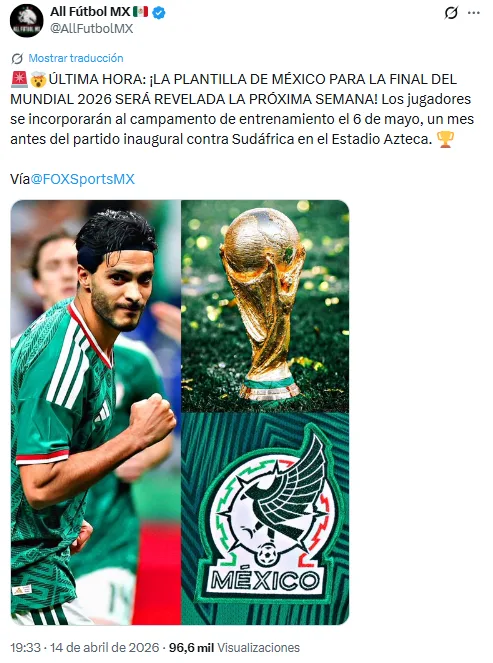 Según informa Fox Sports, la lista de convocados de México saldrá a la luz la próxima semana. Los jugadores deberán sumarse a la concentración del combinado nacional a partir del 6 de mayo. Es decir, poco más de un mes antes del debut oficial en el Mundial 2026.