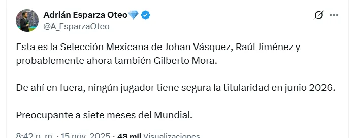 Hasta el momento ni la Selección Mexicana o el cuerpo técnico de Javier Aguirre han confirmado esta información. Pero será entre el 8 y 9 de mayo de 2026 cuando el timonel del equipo mexicano de a conocer la lista final de quiénes serán sus elegidos para ir al Mundial 2026.
