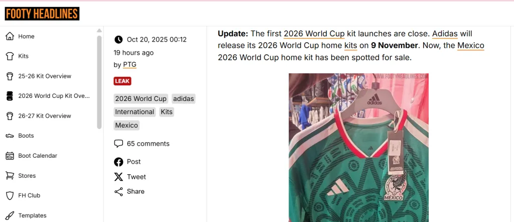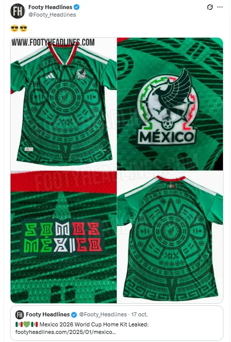 Fue la famosa cuenta de Footy Headlines quienes dieron a conocer que el jersey como local que usará México para la próxima Copa del Mundo de 2026 ya tiene fecha de lanzamiento. Y será el próximo 9 de noviembre de 2025.