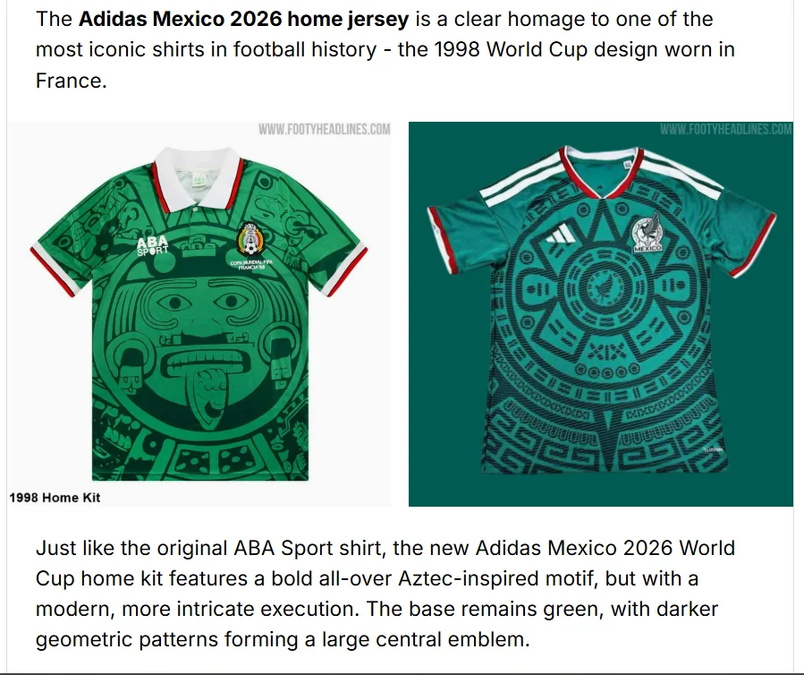 La cual usará los colores típicos de la Selección Mexicana resaltando un patrón geométrico inspirado en la cultura azteca en la parte de adelante. Lo cual rinde homenaje al jersey que se utilizó en el Mundial de 1998 que se jugó en Francia y contará con cuello bicolor.