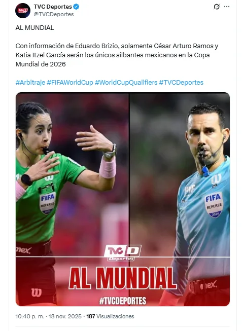 Con información de Lalo Brizio para ESPN en Futbol Picante, donde el exárbitro internacional dio a conocer que el polémico César Ramos y Katia Itzel serán los únicos mexicanos que piten en el Mundial 2026 como silbantes centrales. Por lo que quedan descartados algunos árbitros como el Gato Ortiz.