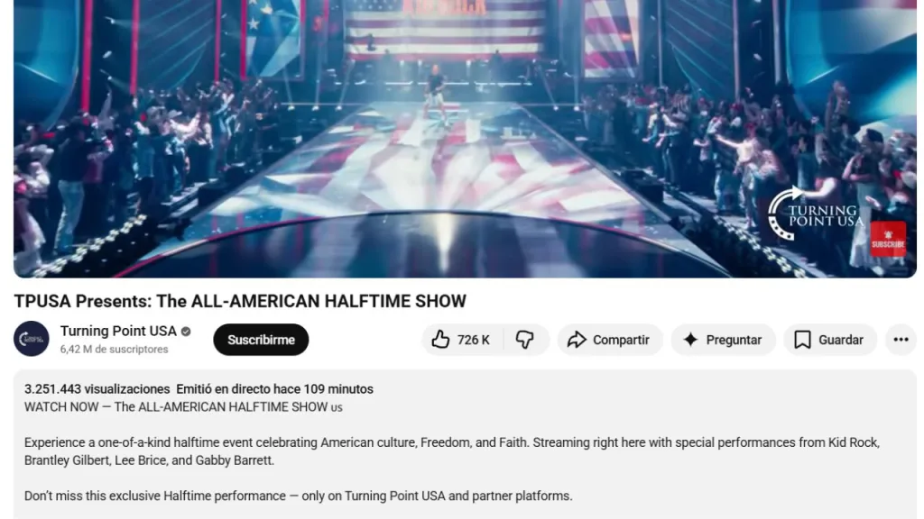 Debajo de estas líneas te dejamos la captura de pantalla de cómo le fue en números al The All-American Halftime Show, el evento promovido por el movimiento Turning Point, que buscando apoyar a Donald Trump y su rechazo al show de Bad Bunny, terminó siendo humillado de forma escandalosa.