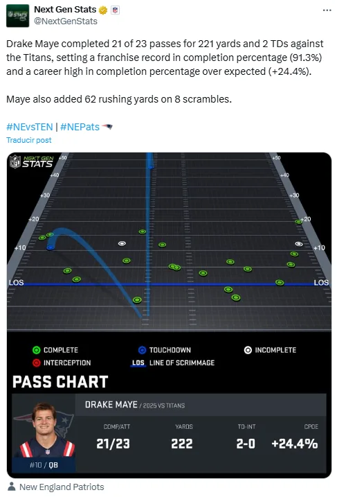 Está claro que igualar las cifras de Tom Brady es una tarea casi imposible, pero un dato sobre Drake Maye ha llamado la atención de muchos. Durante el último triunfo de New England ante Tennessee Titans, el mariscal batió un récord del equipo que pertenecía a la gran leyenda.