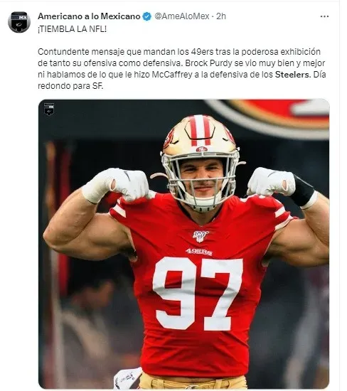 México se prepara para uno de los encuentros más esperados de la temporada regular 2023 de la NFL. Esta vez, los reflectores estarán puestos en el Acrisure Stadium, donde los Pittsburgh Steelers recibirán a los San Francisco 49ers.