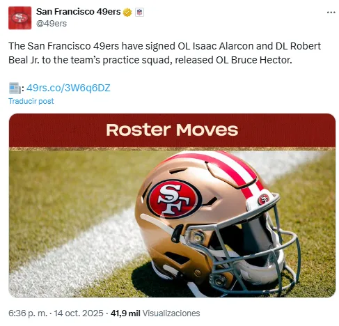 “Los San Francisco 49ers anunciaron la incorporación del liniero ofensivo Isaac Alarcón y del liniero defensivo Robert Beal Jr. a su equipo de prácticas. Para liberar espacio en el equipo, el equipo dio de baja al liniero ofensivo Bruce Héctor” dice el comunicado.