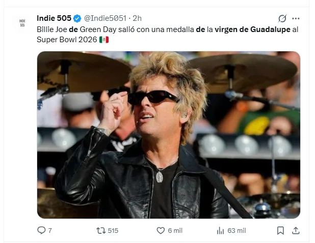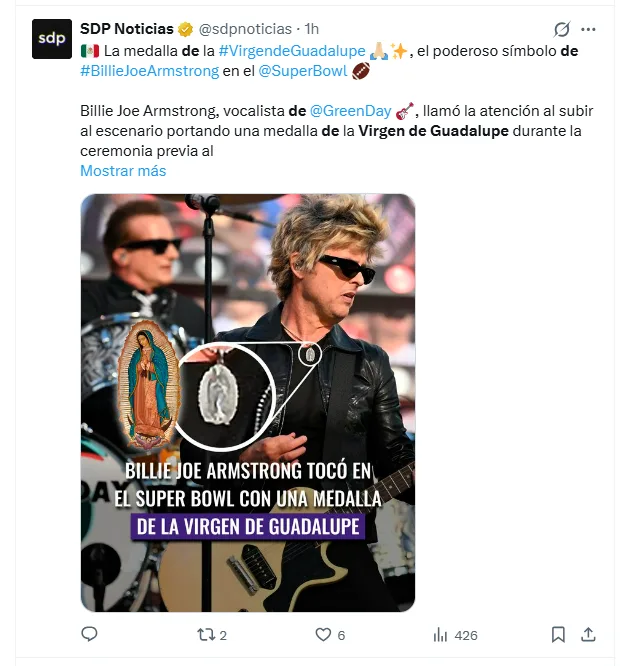 Resulta que la banda estadounidense, Green Day fue la encargada de inaugurar el Super Bowl. Y en esta ocasión Billie Joe Armstrong, vocalista de la agrupación portó una medalla de la Virgen de Guadalupe durante su presentación en el Levi’s Stadium de Santa Clara, California.
