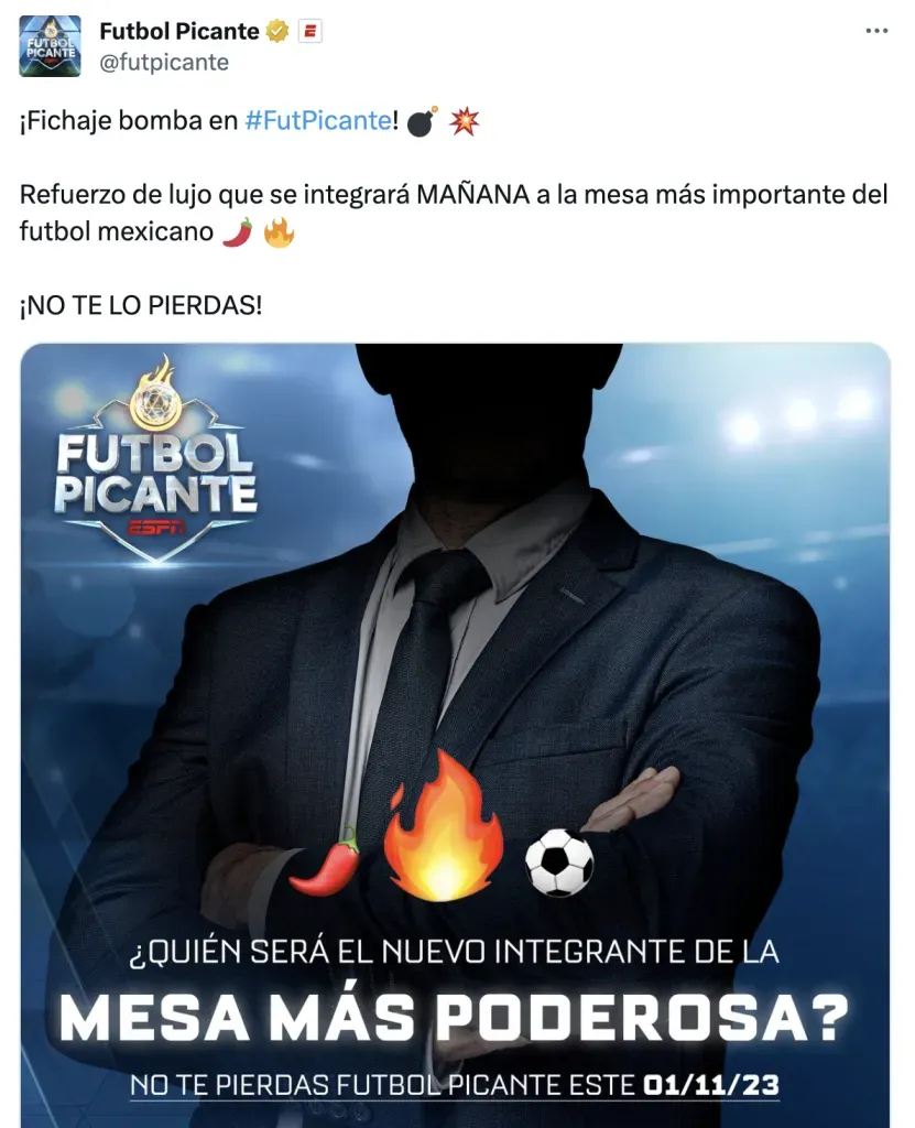 De hecho, en las redes sociales de ESPN y Futbol Picante, ya anunciaron que tendrán un “fichaje bomba”, pero de momento lo mantienen en anónimo, aunque ya es un secreto a voces.
