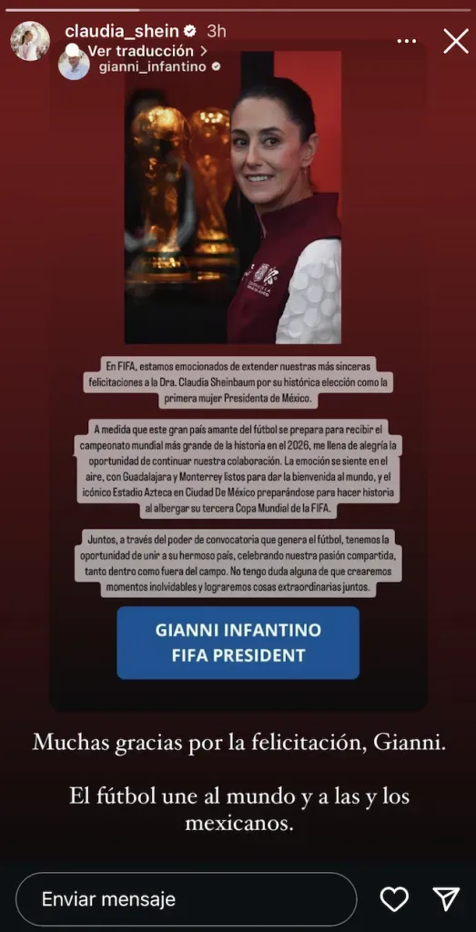 “Muchas gracias por la felicitación, Gianni. El futbol une al mundo y a las y los mexicanos”